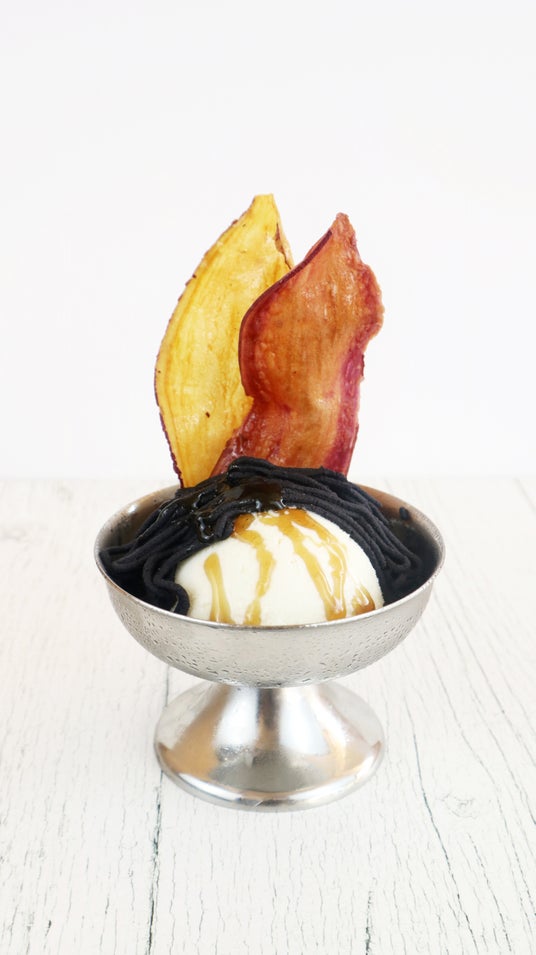 l お好きなsolegeのジェラートにこれまたお好きなカラーの芋んぶらんを贅沢トッピング。サッパリとした味わいのsolegeと芋ンブランの相性はバッチリ。添えられた蜜香屋のチップと一緒に召し上がってください。