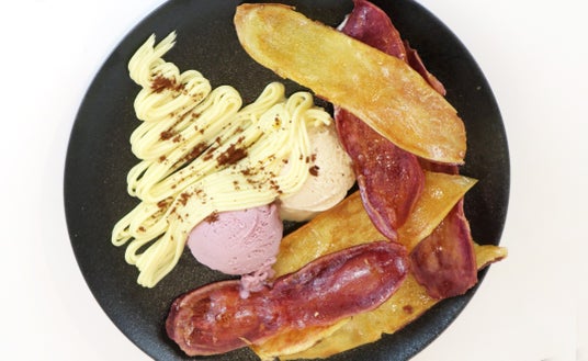 l お皿に敷きつめられた蜜香屋のお芋は秋を感じていただけるよう落ち葉をイメージしました!そこにお好きなsolegeのジェラート2種類をお選びいただき、お芋のモンブランを贅沢にトッピング。まさにお芋づくしの贅沢な秋のプレートの完成です。