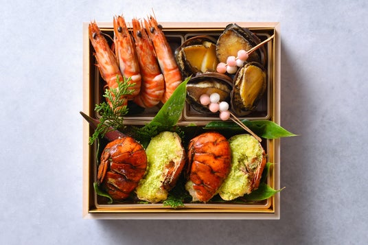 壱の重鮑やオマール海老、車海老など海の幸の縁起物を、素材を生かした丁寧な調理でご用意しました。鮑は丸ごと羅臼昆布の自家製たれでじっくりと柔らかく煮込み、車海老は創業大正14年、かつお節削りの老舗として知られる築地・和田久の鰹節からなる出汁で優しく含め煮にしました。