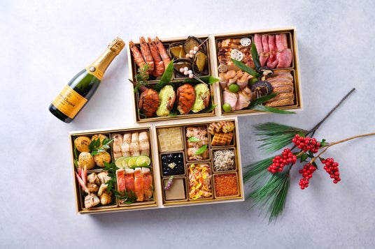 肆の重北海道産花咲カニや、新鮮な活穴子、いくらなど贅沢でシャンパンとの相性もいいメニューをご用意しました。デザートには瀬戸内産レモン果汁100%のほんのり甘く爽やかな酸味の琥珀糖と国産和栗100%のしっとり滑らかな羊羹を詰めました。