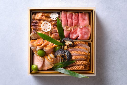 黒毛和牛八女玉露塩ローストビーフ/黒豚黒酢照り焼き/鹿児島県産軍鶏塩?炙り焼き/北海道産鴨胸?油?スモーク/若桃甘露煮