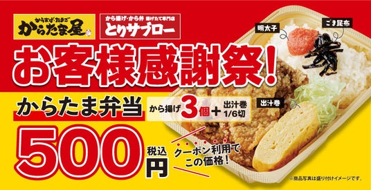 通常740円(税込)(とりサブローは640円(税込))の「からたま弁当」を500円(税込)でご購入いただけます。