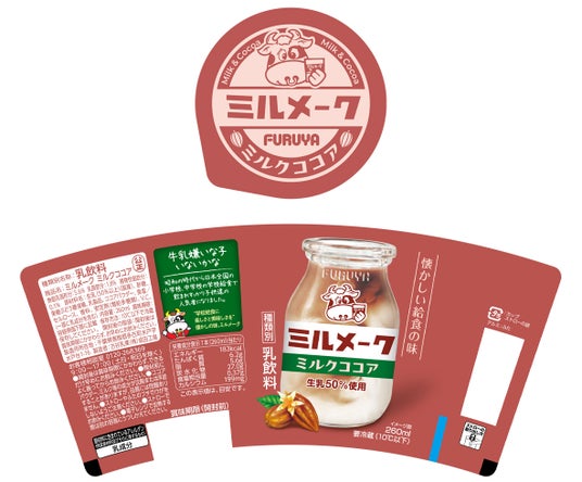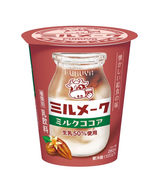 昭和の時代から学校給食で愛されてきた「ミルメーク」と、長年、千葉県の学校給食で親しまれてきた古谷乳業のミルクを組み合わせたチルドカップ飲料の第2弾として、生乳を50%使用し、ミルク感たっぷりのミルクココアを新発売します。