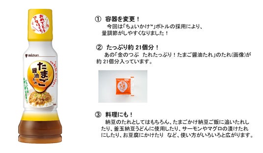 景品の目玉である「たれ“だけ”たっぷり!たまご醤油たれ」は、前回から味わいと容器を見直しております。具体的には皆様から多くいただいた「色々な料理にも使ってみたい!」という声にお応えすべく、醤油感と酸味・甘味・旨味のバランスを微調整し、少し粘性をつけて料理適性を高めております。 もちろん納豆にかけて召し上がっていただいても美味しい品質となっております。おすすめレシピも同封するので、ぜひ色々な料理に試していただきたいです。