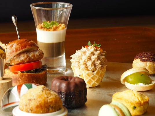イタリアンレストランならではのスイーツやセイボリーが登場するのも、「TORATTORIA M KYOTO」のアフタヌーンティーの見どころ。今回は、パプリカを煮込んだイタリア料理であるペペロナータに、ジェノベーゼ風味を効かせた世界最小のパスタ「クスクス」を合わせた一品、イタリア語で”小さなオレンジ”という意味を持つイタリアの家庭料理「アランチーニ」、また、イタリア発祥のサルシッチャを手作りのバンズで挟んだ「サルシッチャプティバーガー」など、こだわりのセイボリーにも注目。