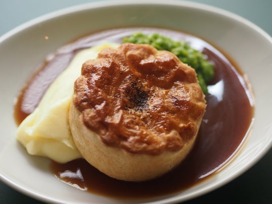 王道のパイ&マッシュ。サクサクの焼きたてミートパイと口溶けのよいマッシュポテトを、濃厚なグレイビーソースと一緒に。