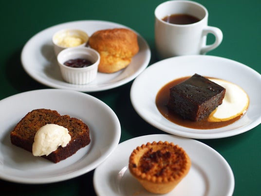 イギリスならではのスイーツ類も充実。ふんわりスコーンにキャロットケーキ、タルトやスティッキートフィープディングも。