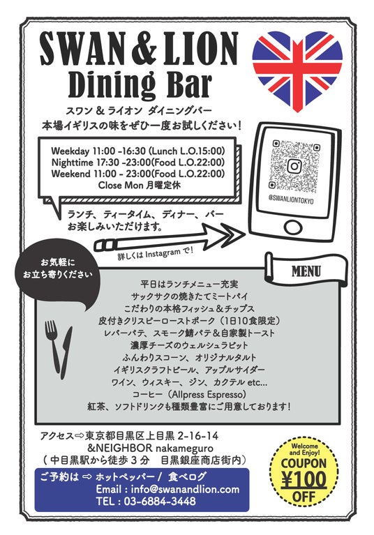 中目黒駅からは徒歩3分、地元の方々も多く行き来する「目黒銀座商店街」のメイン通り沿いに誕生したスワン&ライオン。