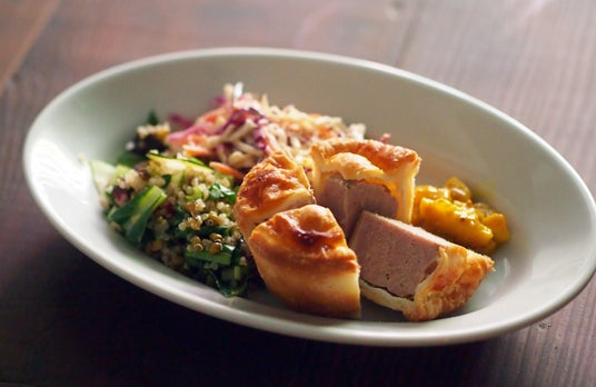 イギリス料理ではお馴染みのコールドポークパイ。スパイス香る豚肉がぎゅっと詰まった一品。自家製のピカリリ(カレー風味のピクルス)を添えて。