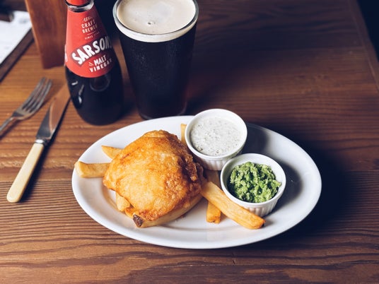 オリジナルレシピのフィッシュ&チップス。自家製タルタルソースとミント香るグリンピースを添えて。モルトビネガーも欠かせません。