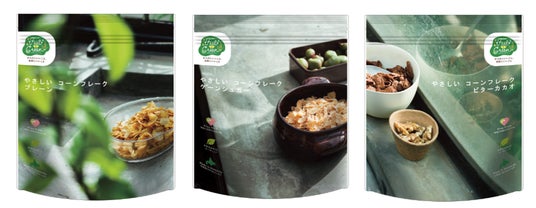左 日食 Feel & Green やさしい コーンフレーク プレーン /中央 日食 Feel & Green やさしい コーンフレーク ケーンシュガー /右 日食 Feel & Green やさしい コーンフレーク ビターカカオ