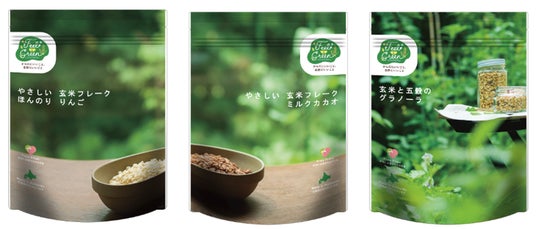 左 日食 Feel & Green やさしい 玄米フレーク ほんのり りんご /中央 日食 Feel & Green やさしい 玄米フレーク ミルクカカオ/ 右 日食 Feel & Green 玄米と五穀のグラノーラ