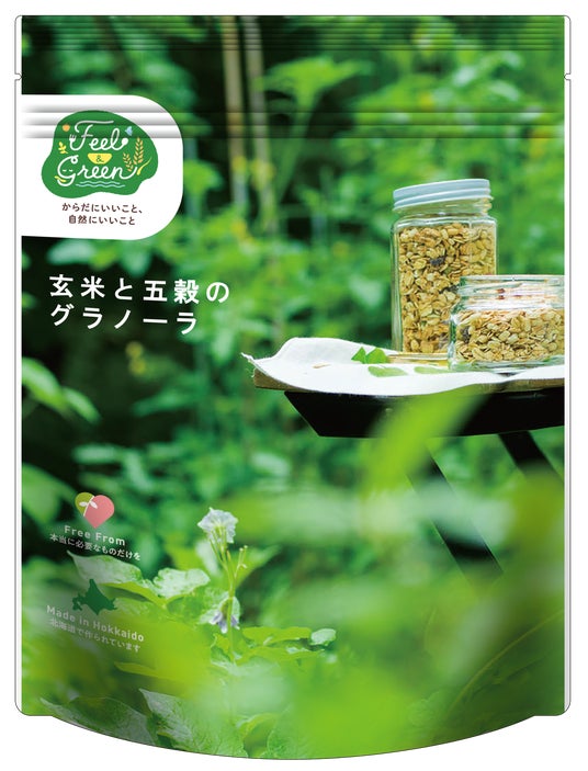 できるかぎり余計なものを入れずに、「本当に必要な」ものだけで作ったこだわりの北海道産玄米が主役のグラノーラ。玄米に、オーツ麦、大麦、小麦、大豆、とうもろこしの五穀を合わせて、軽めな食感に仕上げました。自然なやさしい味付けのグラノーラです。