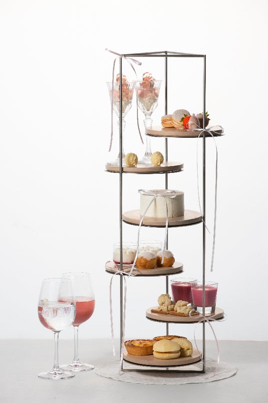 六本木ヒルズ森タワーのシルエットと店名「THE MOON (=月)」をイメージした高さ70cmを超える6段のスタンドには、ハートのジュエリーをモチーフにしたみずみずしく爽やかな甘さの白桃ゼリーやムースとフロマージュブランを使ったパフェや、甘酸っぱいラズベリーソースと濃厚なマロンが相性抜群のムース、「Bijou de M」のロゴをあしらったホワイトケーキをはじめとするパティシエこだわりのスイーツ8種。さらにビーツを使用した鮮やかな色味と自然な甘みを楽しめるポタージュ、風味豊かなモッツァレラチーズのキッシュなどのシェフ特製のセイボリー4種がラインナップ。Bijou de Mのブランドカラーであるピンクとホワイトを基調としたアフタヌーンティーです。
