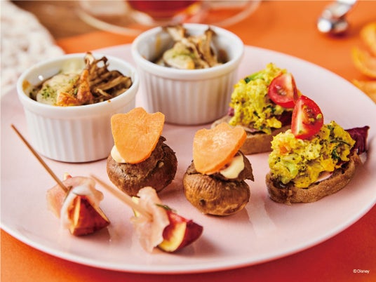 <ハーベストミールプレート>ドナルドダックの足型のにんじんを乗せたマッシュルームミートボール、お豆と舞茸のミニグラタン、かぼちゃと海老のタルティーヌ、季節の果物と生ハムなどお食事メニューを楽しめるプレートです。