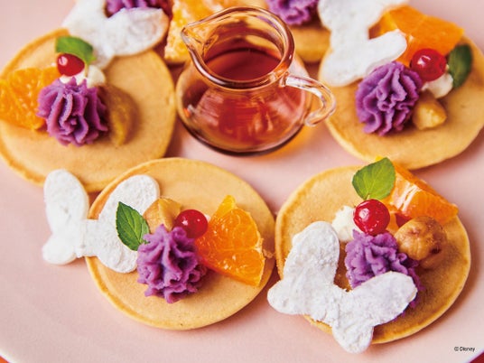 <オートミール入りパンケーキプレート>オリジナルのオートミールパンケーキをミニサイズにし、紫芋とさつまいものクリームに季節のフルーツとデイジーダックのリボン型求肥をあしらったカラフルパンケーキ。メープルシロップをかけて召し上がれ。