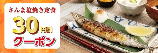 ただいま、「定食屋宮本むなし」で販売期間中に何度でも使える「さんま塩焼き定食各種30円引きクーポン」を配信しています。会員の方限定でご利用いただけるクーポンですので、この機会にぜひ宮本むなし公式アプリをダウンロード&会員登録して、お得にご利用ください。