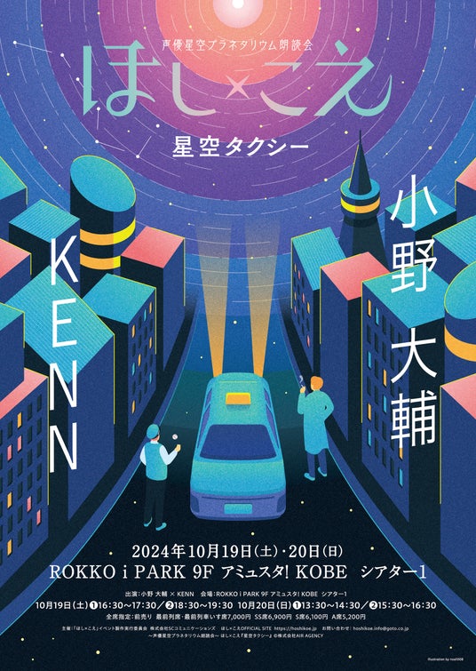 「アミュスタ!KOBE」 (所在地:兵庫県神戸市)にて、 『~声優星空プラネタリウム朗読会~ほし×こえ『星空タクシー』 【神戸公演】小野大輔×KENN』の特別公演を開催します。 今回はプラネタリウムを飛び出して、初のシアターからほし×こえの物語をお届け。チケットは9月6日(金)19:00より先行販売(抽選)開始です。