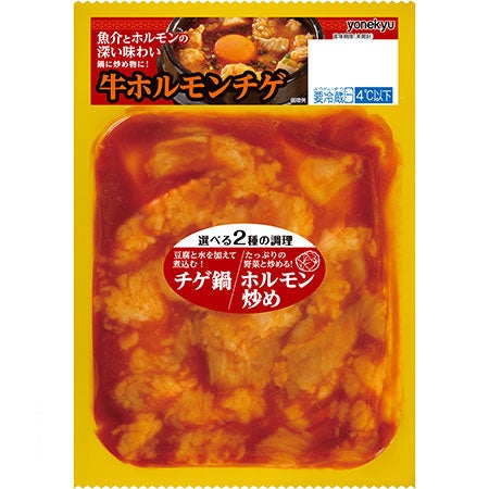 「牛ホルモンチゲ」は、魚介・牛・豚・野菜エキスに、にんにく・唐辛子などを加えた旨辛たれで味付け。水と豆腐を加えて鍋調理や、たっぷり野菜を加えて炒め物にと、2種類の調理方法で楽しめます。