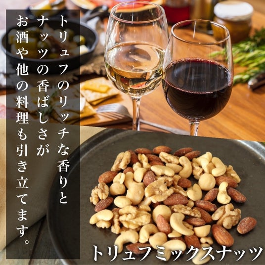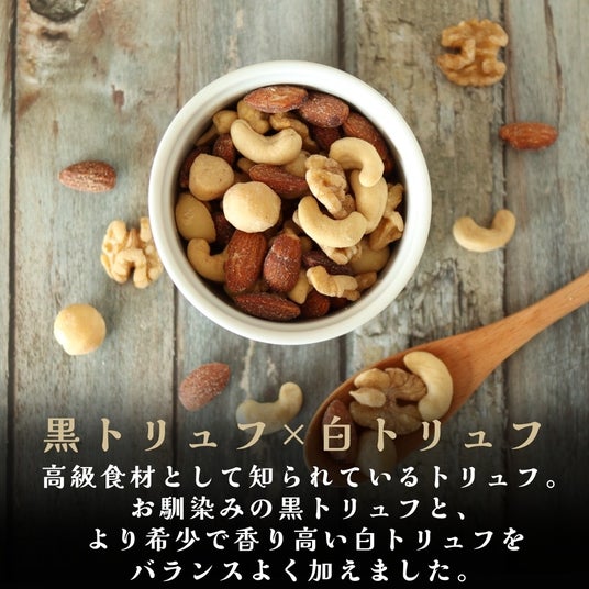 【原材料名】ミックスナッツ加工品(アーモンド(アメリカ産)、カシューナッツ(インド産又は)ベトナム産)、クルミ(アメリカ産)、マカダミアナッツ(オーストラリア産)、植物油脂、食塩、バター(乳成分を含む)、黒トリュフ(イタリア産)、白トリュフ(イタリア産))/香料