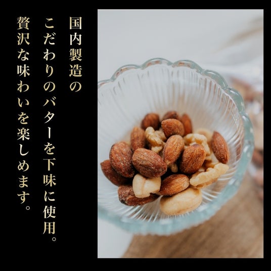 【原材料名】アーモンド(アメリカ産)、カシューナッツ(インド産)、クルミ(アメリカ産)、マカダミアナッツ(オーストラリア産)、食塩、植物油脂、バター(一部に乳成分を含む)