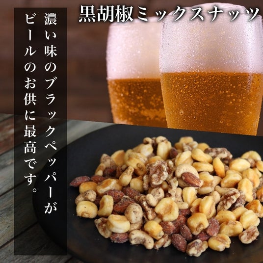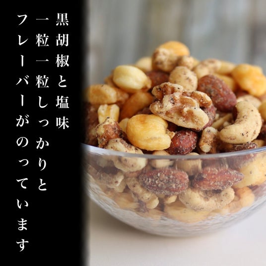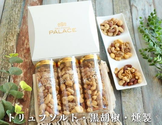 トリュフミックスナッツ、黒胡椒ミックスナッツ、燻製ミックスナッツの3つのバリエーションが楽しめます。