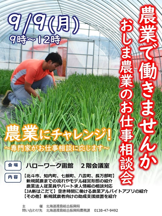 渡島総合振興局では、渡島管内の関係機関と連携し「おしま農業のお仕事相談会」を開催します。