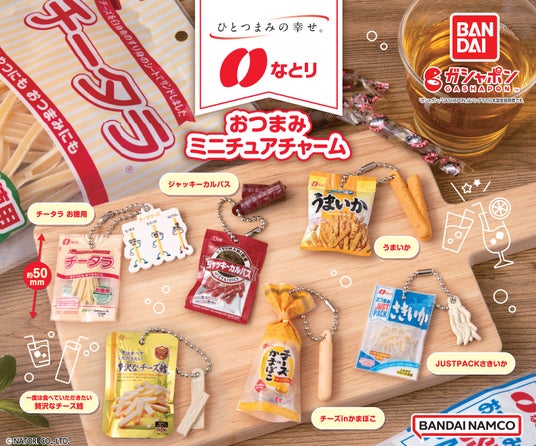 株式会社なとり(本社:東京都北区、会長兼社長:名取三郎)の主要商品をミニチュアにした「なとり おつまみミニチュアチャーム」が、株式会社バンダイ(本社:東京都台東区、社長:竹中 一博)が展開する「ガシャポン(R)」 (※1)に初登場します。2024年9月第2週より順次、全国の「ガシャポン(R)バンダイオフィシャルショップ」をはじめ、玩具売り場、量販店、家電店などに設置されたガシャポン自販機シリーズにて発売されます。