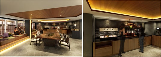 京都市営地下鉄烏丸線・東西線「烏丸御池」駅 6 番出口より徒歩 2 分の静かな裏通りに建つ「東急ステイ京都三条烏丸 -はなれ-」の 1 階ロビーラウンジは、上質で温もりのある洗練されたデザインへリニューアルし、宿泊者専用の新たな寛ぎの空間「らうんじはなれ」に生まれ変わります。中央には大きなテーブルと座り心地のよい椅子を設置し、その傍らには靴を脱いで脚を伸ばせる畳の小上がりスペースを設けます。ここでは、一緒に旅をするご家族やお仲間とひと息つくもよし、このラウンジで顔を合わせたご宿泊者同士に自然な会話が生まれ、旅先で出会ったものや思い出を共有していただくのもよし、国籍や年齢問わず交流いただける場としてもご利用いただける空間です。