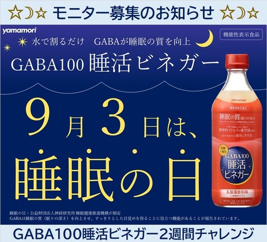 総合食品メーカー、ヤマモリ株式会社(本社:三重県桑名市、社長:三林 圭介)は、2024年9月3日(火)の「秋の睡眠の日(※1.)」を受け、自社の機能性表示食品「GABA100睡活ビネガー」のモニター300名を募集します。