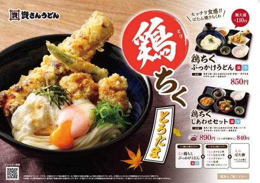 ※「鶏ちくぶっかけうどん」「鶏ちくしあわせセット」は2024年9月4日(水)9:00~期間限定での販売となり、終了日時は店舗により異なる場合がございます。予めご了承ください。