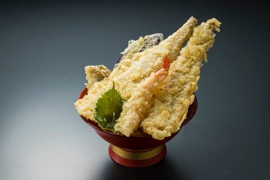 穴子天をジャイアント馬場さんの16文に見立て、穴子天2尾を、海老天、野菜天と合わせてのせた天重です。ごはんは、1.5倍で盛り付けます。