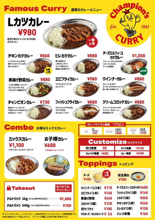 店舗はチャンピオンカレーのイメージカラーの黄色を差し色にしながらも落ち着きのある雰囲気です。カウンター席とボックス席があり、お一人でもご家族やお仲間とも入りやすい空間となっています。チャンピオンカレーの来店者のおよそ7割が注文する看板メニュー「Lカツカレー」の他、多彩なトッピングでお好みのカレーをお楽しみください。テイクアウトメニューのほか、冷蔵カレーやレトルトカレーの取扱いも行います。是非お店でもおうちでもチャンピオンカレーをお楽しみ下さい。