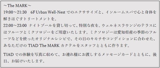 「TIAD, オートグラフ コレクション」(所在地:名古屋市中区栄5-15-19、総支配人:中澤旬史、以下 TIAD)は、良質な睡眠を届ける限定プラン、2泊3日の “The MARK”をご提供します。