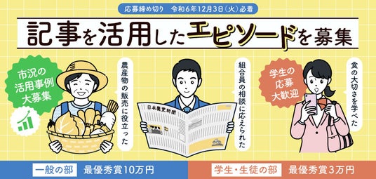 日本農業新聞(本社:東京都台東区、代表取締役社長:田宮和史郎)は、「日本農業新聞」の記事が、営農や生活、勉強に役立ったエピソードや事例を、読者の皆さんから広く募集しています。ふるってご応募ください。