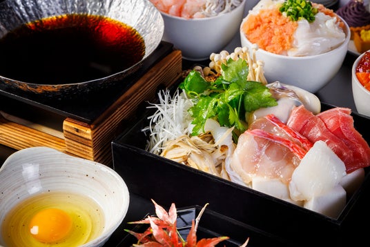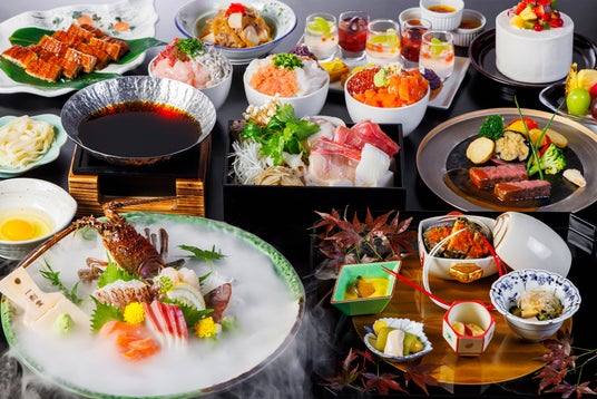 「秋の味覚 豪華特選会席プラン」は彩豊かな前菜に始まり、伊勢海老のお造り、魚料理は金目鯛や蛤など新鮮な魚介が楽しめる「魚すき(うおすき)」をご用意。「魚すき」とは魚介をすきやきの出汁にくぐらせて野菜と一緒にお召し上がりいただく料理です。メインは国産牛ローストビーフをご用意しました。まるでステーキのように厚みがあり低温で火を入れることで旨味を凝縮させたこだわりの一品です。ご飯・デザートはビュッフェコーナーから思う存分に お楽しみいただけます。料理長が腕によりをかけた至極の料理をご堪能ください。