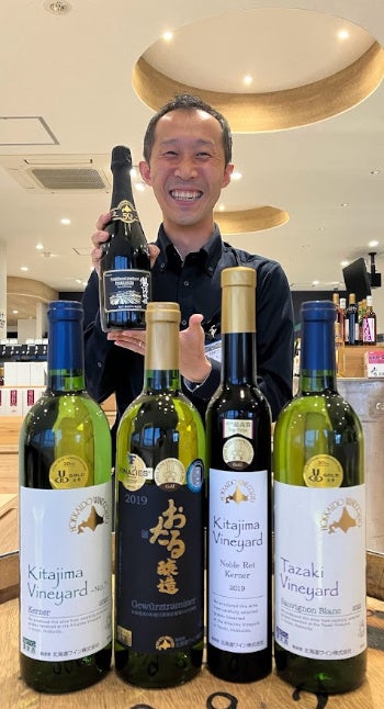 (今回のラインナップを担当した営業・ソムリエ有資格の松村)*松村が手にする「50周年記念醸造 トラディショナルメソッド北海道スペシャルキュヴェ(瓶内二次スパークリングワイン・Brut)」と日本ワインコンクール2023金賞・部門最高賞受賞「北島ヴィンヤードNoble Rot Kerner 2019(極甘口)」(右から2番目)は有料試飲にてご提供いたします。