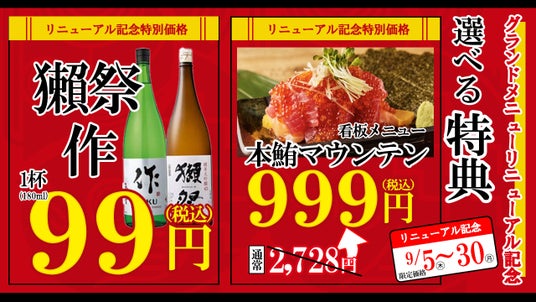 ・「本鮪マウンテン999円」「獺祭・作1杯99円」どちからからかお選びください。