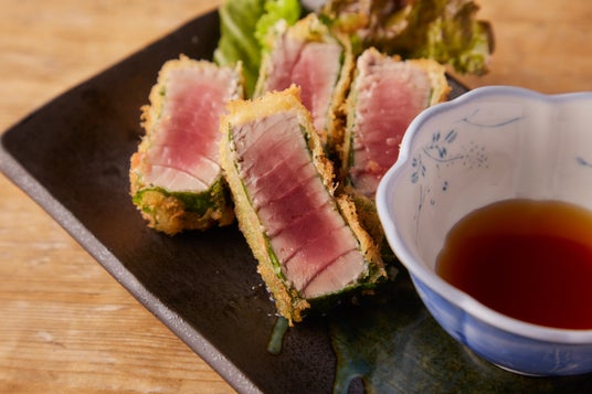 絶妙な揚げ加減でレアで提供致します。出し醤油でお召し上がりください。