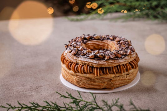 濃厚なヘーゼルナッツのプラリネクリームとアーモンド香るカスタードクリーム、そしてミニエクレアをリング型のシュー生地でサンドした、クリスマスリースをイメージさせるケーキです。たっぷりのアーモンドとヘーゼルナッツ、カカオニブの食感がアクセント。それぞれの素材が奏でる濃厚な味わいのハーモニーが人気のケーキです。