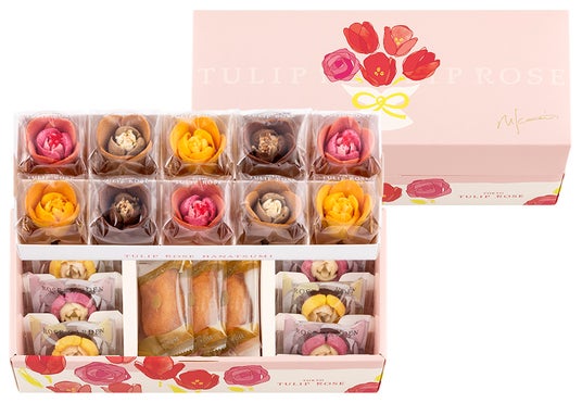 【内容量】チューリップローズ(ベリー・パッションマンゴー 各3個、キャラメルナッツ・モンブラン 各2個)、ローズガーデン(カシスバニラ・カルダモンシトロン 各3個)、チューリップローズ フィナンシェ 3個