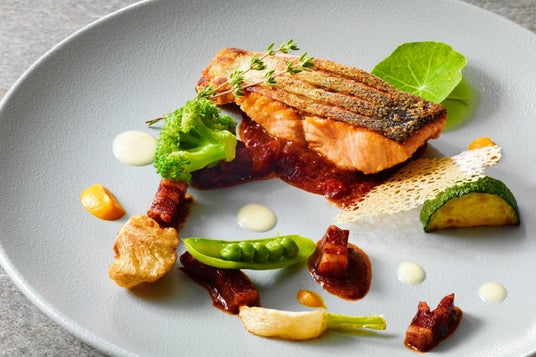 脂のりの良い新鮮な秋鮭を、赤ワインと北海道産ベーコンのオリジナルソースで盛り付けました。
