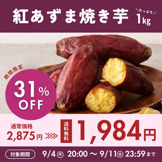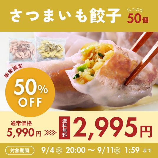 他にも楽天スーパーセールの期間中の9月4日(水)20:00~9月11日(水)1:59は『冷凍紅あずまの焼き芋』や、『さつまいも餃子』も大変お買い求め安くなっております。
