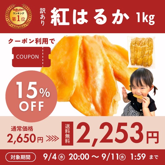 創業からわずか2年で、ネット通販1日1万件以上の注文を記録し、楽天市場で総合ランキング1位を獲得した芋國屋が楽天スーパーセール中『人気No,1訳あり 紅はるか干し芋 1kg』を15%OFFの2,253円で販売いたします。