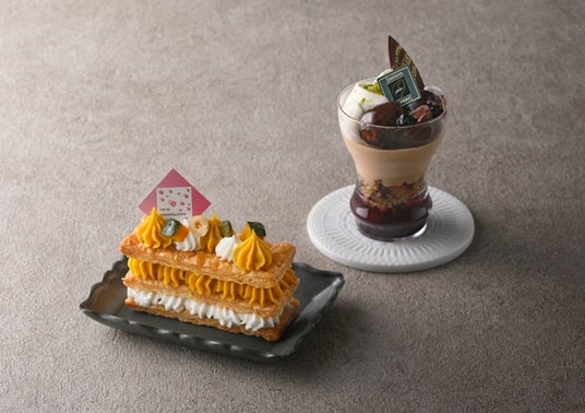 【銀座三越限定】左から:〈ザ ヴィーガン マシュマロ〉 かぼちゃヴィーガンミルフィーユ 1,188円、〈日本橋 千疋屋総本店〉 マロンとカシスのヴェリーヌ 864円
