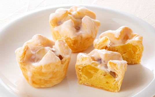 左:バター不使用のミルフィーユに、かぼちゃクリームと豆乳クリームをのせた秋限定の味。