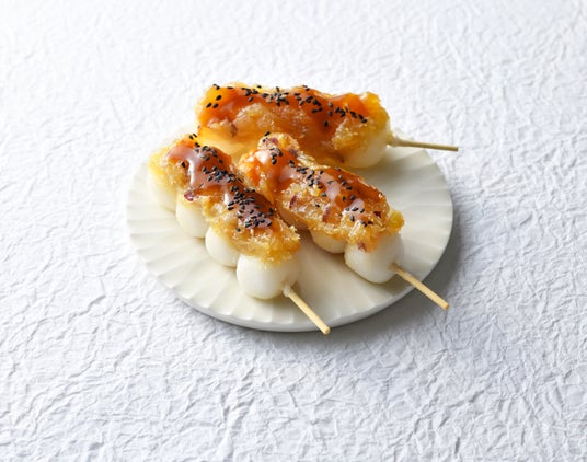 出汁が効いた甘じょっぱいみたらしダレと、赤糖でコクを出したゴロゴロ食感がうれしい紅はるかの芋餡をのせた大学芋風味の繁盛団子。