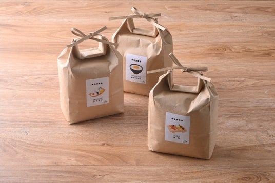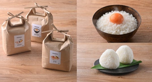 【銀座三越限定】〈米屋 彦太郎〉左から:千葉県産・鳥取県産 五つ星お米マイスターブレンド おむすび米 1,080円、高知県産・青森県産 五つ星お米マイスターブレンド 卵かけごはん 1,080円、秋田県産・山形県産 五つ星お米マイスターブレンド 寿司米 1,080円