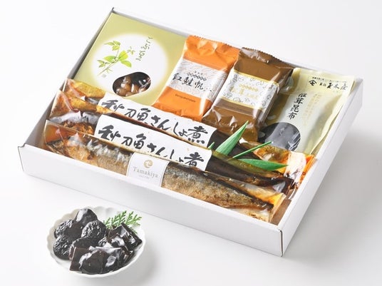 秋刀魚など秋の新米がはかどるセット。【銀座三越限定】〈新橋玉木屋〉秋味詰合せ 5,940円 (秋刀魚さんしょ煮×2・秋刀魚ゲランド塩・ 佃煮ふりかけ松茸土瓶蒸し・紅鮭帆立×各2・ 江戸佃煮椎茸昆布・こぶ豆)