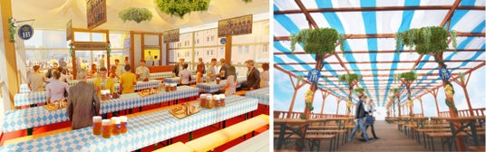 昨年から座席数を増やした全天候型のテントエリアと、海風を感じられる開放的な空間が魅力のウッドデッキエリアがあり、テーブル席ではご家族・仲間同士で、カウンター席ではお一人様やカップルでもゆったりお過ごしいただけます。ブース内は本場オクトーバーフェストの会場をイメージし、ミュンヘンのホフブロイテントの象徴であるホップを各所に装飾。ほのかなホップの香りまで再現します。また、ウッドデッキエリアは木製パーゴラと緑で、涼しげなガーデンレストランを演出します。